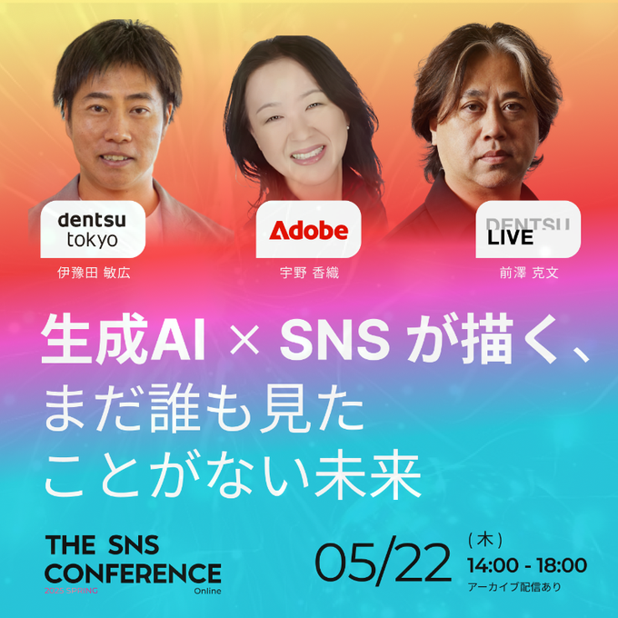 - このバナーデザインは、ビビッドなグラデーション背景が視線を引きつける、非常にエネルギッシュで現代的な印象を与えます。オレンジからピンク、そしてブルーに変化するカラフルな配色が、未来感や先進性を巧みに演出しています。登壇者の顔写真を上部に配置し、それぞれの企業ロゴ(dentsu、Adobeなど)と名前が明記されており、セミナーの信頼性を強調しています。中央のメッセージ「生成AI × SNS が描く、まだ誰も見たことがない未来」が白抜きの大きな文字で配置され、非常に強い訴求力を持っています。全体的にバナー、デザインともに高い完成度を誇り、情報のインパクトとビジュアルの調和が見事に取れています。デザインとしても、未来志向や革新性を伝える点で非常に優れたバナーです。