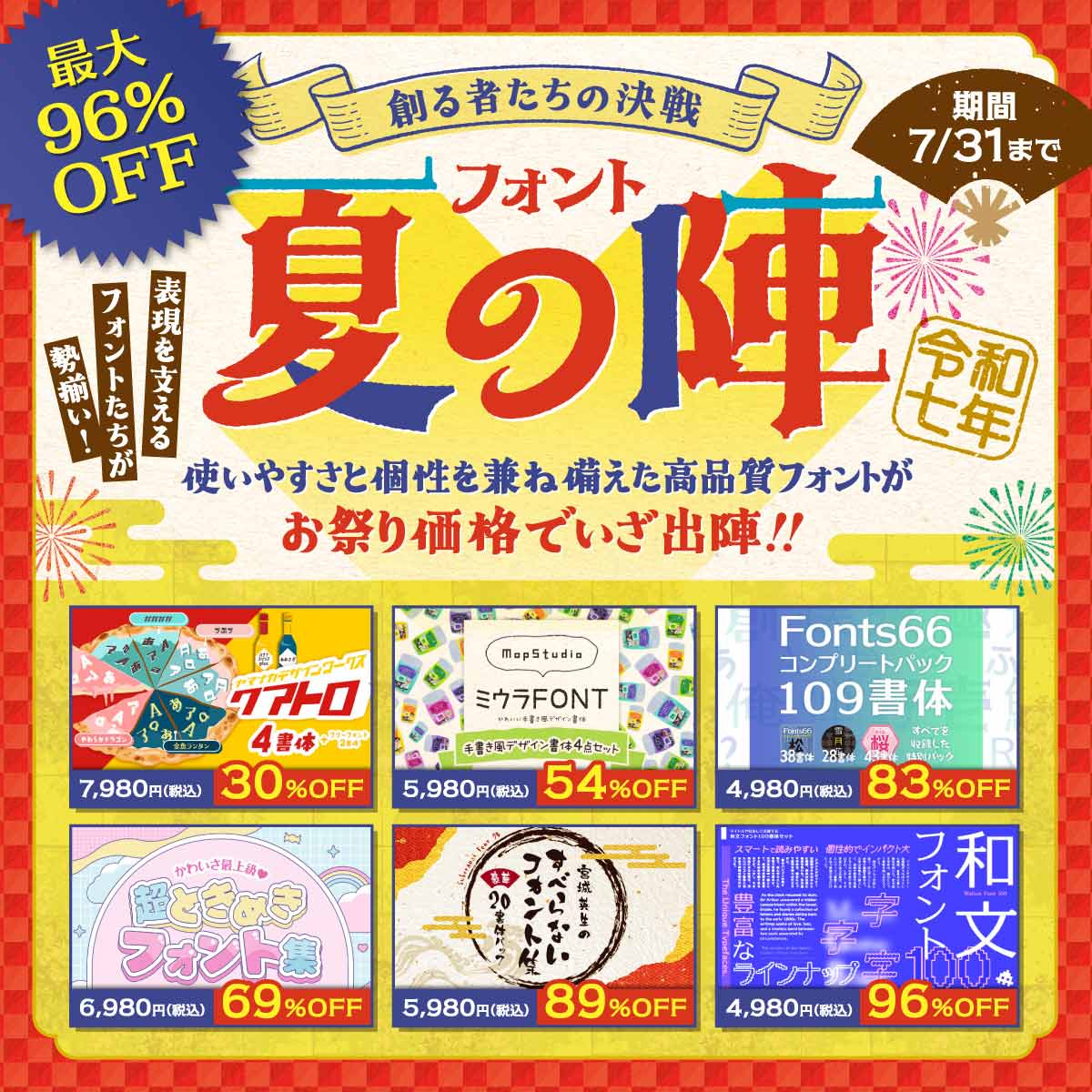 - このバナーは、視覚的に非常に鮮やかで活気のあるデザインが特徴です。背景に夏らしい色合いのパターンや花火が施され、セール感を強調しています。商品のフォントパックが並べられ、各商品に対する割引情報(最大96%OFF)が大きく目立つように配置されています。明るい色合いのフォントとキャッチコピーが、デザイン業界のターゲット層にアピールし、購入を促進しています。全体的に夏のイベント感を出しつつ、商品の価値とセール情報がしっかり伝わるデザインです。