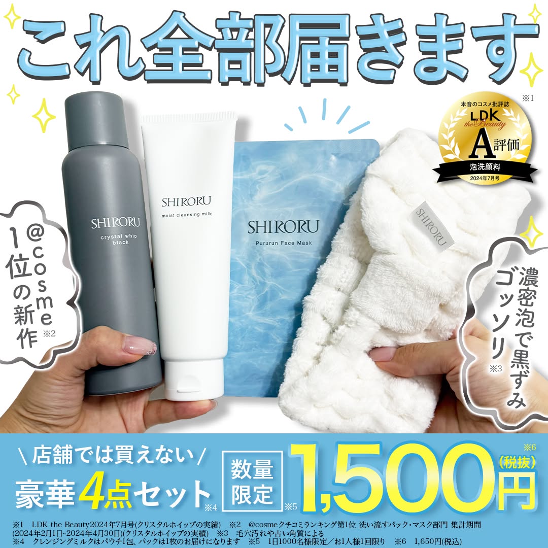 - バナーはシンプルで、清潔感のあるホワイトとグレーを基調にしており、商品の質感や効果を強調しています。「これ全部届きます」との大きな文字が目立ち、注目を集めます。商品内容が4点セットであることを強調し、特に「濃密泡で黒ずみゴッソリ」のキャッチフレーズが目を引きます。また、SHIRORUのブランド名が繰り返し配置され、視覚的に強い印象を与えています。全体的に新しい商品や特別感を感じさせるデザインが印象的です。
