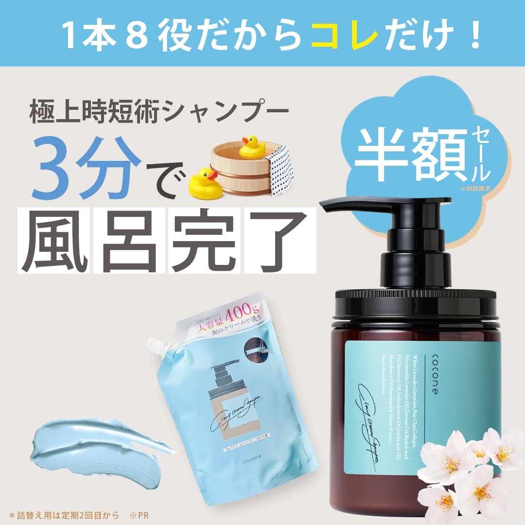 - このバナーは、シンプルで爽やかな色合いを使用しており、製品の特長を視覚的に伝えています。アイテムの写真がクリアで、美容やシャワーを想起させるイメージが強調されています。「3分で風呂完了」といったキャッチコピーが目を引き、使い勝手の良さを前面に出しています。また、商品のパッケージデザインが洗練されており、実際の製品に近い形で視覚的に訴えかけているのが特徴です。