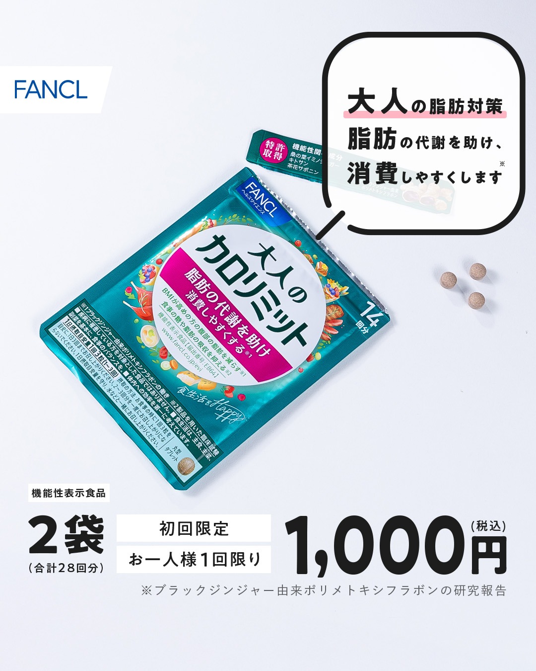 - このバナーはシンプルで直感的に製品の特徴を伝えるデザインです。背景は明るいホワイトとグリーンの色合いで、製品自体が目立つように配置されています。「大人の脂肪対策」というメッセージが強調されており、健康的な印象を与えています。また、特典情報(初回限定1,000円)や数量限定の案内が目立つように配置されており、購入意欲を引き立てる効果的なデザインです。製品の効果をしっかりと伝え、シンプルでありながら注目を集めるビジュアルが特徴です。
