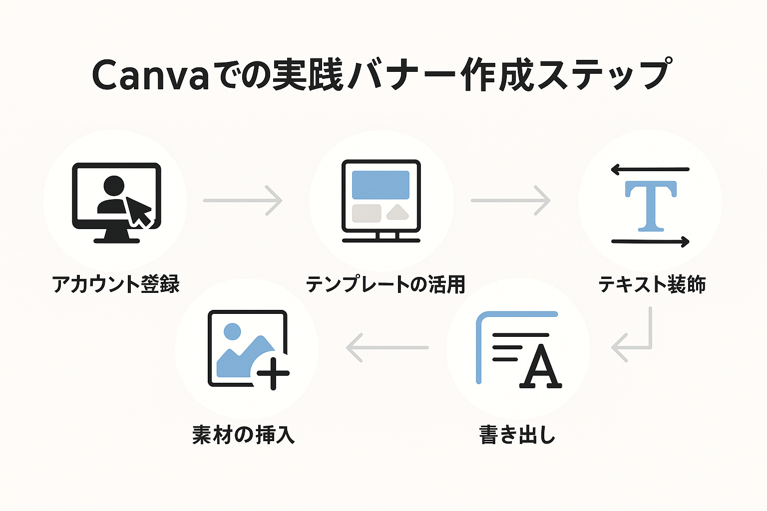 理論を理解した後は、実際にCanvaでバナーを作成する流れをステップごとに確認しましょう。Canvaは直感的な操作が可能な一方で、効率よく美しいデザインを仕上げるには手順の理解が大切です。この項目では、アカウント作成から素材の配置、完成データの書き出しまで、実践的な作成手順を解説します。