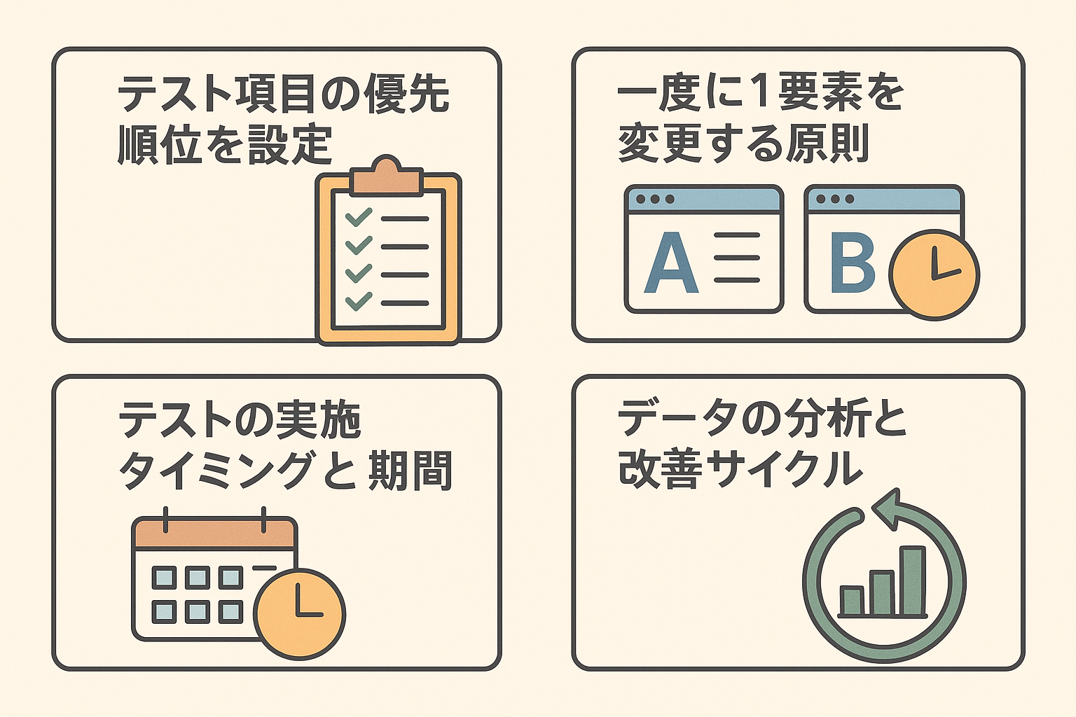 A/Bテストを行う際、すべての要素を同時に変更しては意味がありません。「変化の影響が大きい要素」から優先的に検証するのがセオリーです。たとえば、まずはバナーのメイン画像、その次にCTA文言、色、レイアウトの順で一つずつ変更し効果を測定するのが効果的です。